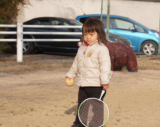 2歳の娘も巻き込んで、早速近所の公園でテニスを始めた。
